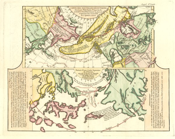 Note | Carte des nouvelles découvertes / dressée par Phil. Buache, Pr. géogr? du Roi, presentée à l'Acad. des Sciences le 9 Aout 1752 et approuvée dans son assemblée du 6 Septembre suivant. Extrait d'une carte Japonaise de l'univers : apportée en Europe par Kaempfer et deposée dans le cabinet de feu Mr. Han Sloane, président de la Société royale de Londre. Map 1 (upper) Scale approximately 1:35,000,000. -- Map 2 (lower) Scale approximately 1:50,000,000. 2 maps on 1 sheet : hand colored, copperplate engraving ; 15 x 31 cm and 15 x 28 cm, sheet 40 x 46 cm Shows territories, bodies of water, routes of explorers, and notes on voyages and discoveries. Comparative cartography of the West Coast of North America and Northeast Coast of Asia, based upon Buache. The various Russian discoveries between 1731 and 1742 are shown in the upper map, including the Sea of the West and various explorers routes and notes. The bottom map is based upon a Japanese map taken by Kaempfer back to Europe. Diderot's work is part of a 10 map supplement to his Encyclopedia, and provides one of the most fascinating studies in contemporary comparative cartography which can be obtained by collectors, much of which is dedicated to the NW Coast. BLR#84038 |